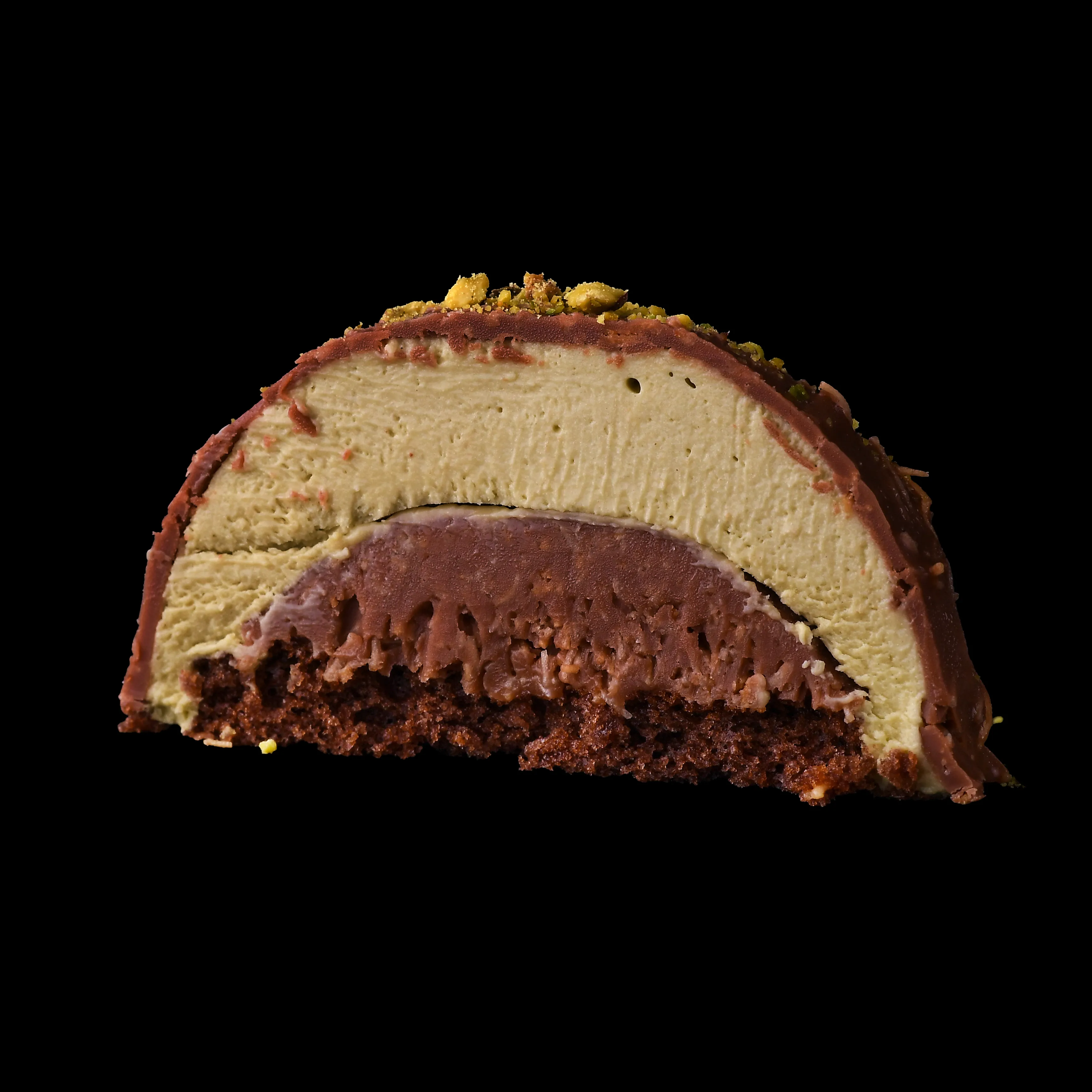 Mousse cioccolato bianco, cioccolato, crema di pistacchio, granella di pistacchio, pasta kataifi.